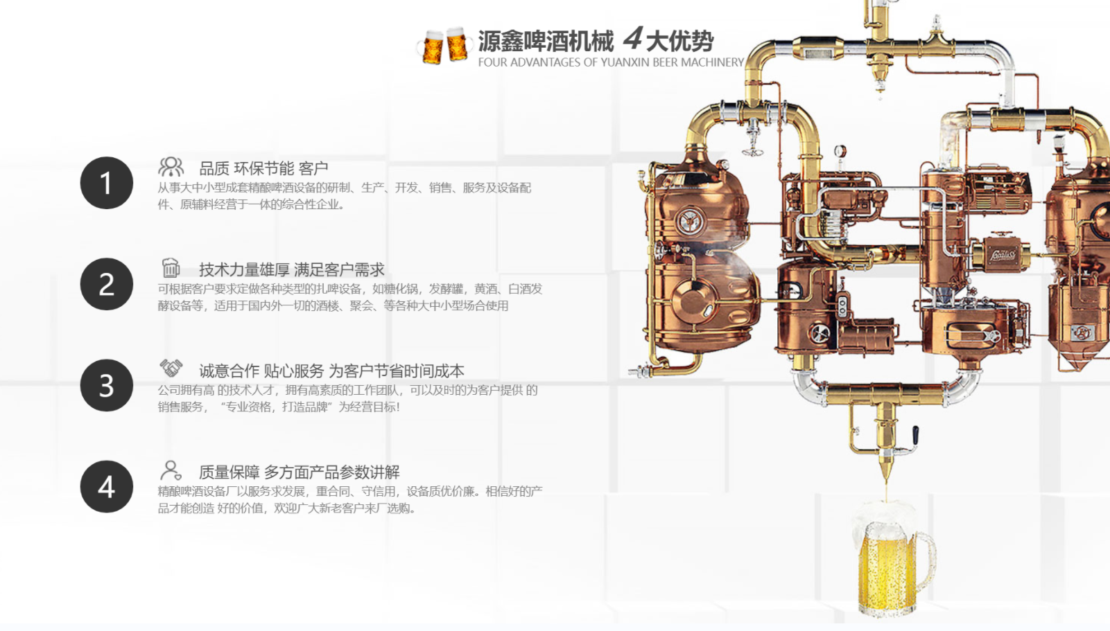 南陽市源鑫啤酒機(jī)械設(shè)備有限公司位于歷史文化名城一-南陽,從事大中小型成套啤酒、白酒自釀設(shè)備的研制、生產(chǎn)、開發(fā)、銷售、服務(wù)及設(shè)備配件、原輔料經(jīng)營于一體的綜合性企業(yè)。公司可根據(jù)客戶要求定做各種類型的扎啤設(shè)備,如糖化鍋,發(fā)酵罐,黃酒、白酒發(fā)酵設(shè)備等,適用于國內(nèi)外一切的酒樓、餐廳、家庭.聚會(huì)、酒吧等各種大、中、小型場合使用。公司擁有技術(shù)人才,擁有高素質(zhì)的工作團(tuán)隊(duì),可以及時(shí)的為客戶提供**的銷售服務(wù)。公司以“專業(yè)資格,打造品牌”為經(jīng)營目標(biāo),“卓越質(zhì)量,信賴價(jià)格”為經(jīng)營宗旨,以質(zhì)量求生存,以服務(wù)求發(fā)展,重合同、守信用,設(shè)備質(zhì)優(yōu)價(jià)廉。相信好的產(chǎn)品才能創(chuàng)造 好的價(jià)值,歡迎廣大新老客戶來廠選購。...